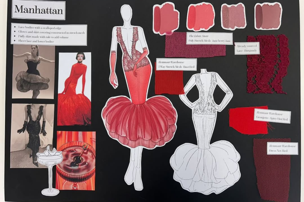 A Toast to Time: Elegance in a Glass features three costume pieces inspired by classic cocktails: a Martini, a Manhattan, and a Champagne. Each one starts with the glass shape and the atmosphere of the drink. The Manhattan is deep cherry red, the skirt’s volume referencing an upside-down cocktail glass, the fabric catching light like liquid.