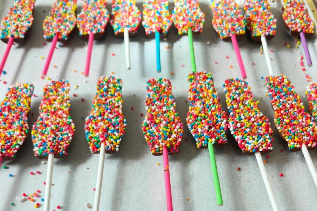 For Easter, the display fills up with handmade Belgian chocolate eggs and rabbits made in-store, along with their fan-favourite freckle bunny pops — milk chocolate bunny lollipops covered in colourful 100s and 1000s.