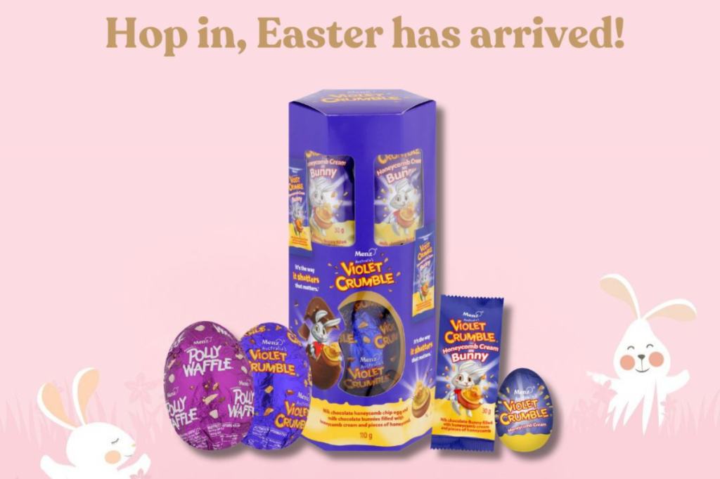 Their range leans into the classics – Violet Crumble honeycomb eggs and bunnies and the Polly Waffle Easter egg, filled with marshmallow and wafer pieces.