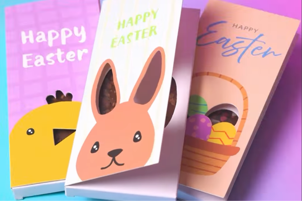 The Easter versions feature bunny, chick and Easter basket designs. You write your message inside, and the chocolate does the rest.